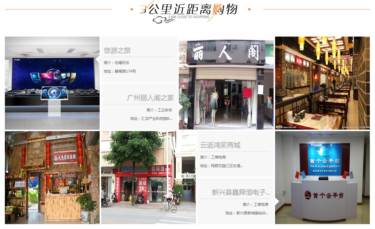 3 公里近距离购物:以乡村(社区)为单位,实现 3 公里近距离购物,将城市的科技产品、服务产品送到乡村,将乡村的产品、特色资源进行线上推广销售,让农民、居民在家门口实现网上购和销,做到: 工业品下乡最后一公里! 农产品进城最初一公里!